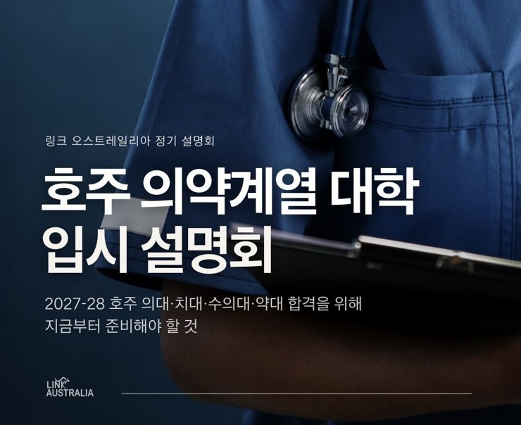 • 2025년 한 해 동안 총 6회의 호주 의약계열 입시설명회를 진행하였습니다. 매 회차 많은 학생·학부모님께서 찾아주셨고,“다른 곳에서 찾기 어려운 정보를 알 수 있어 정말 도움이 됐다”는 소중한 피드백을 많이 받았습니다. 그 뜨거운 관심에 힘입어, 2026년에도 입시설명회를 이어갑니다. <2026년 1차 호주의약계열 입시설명회> - 1월 11일 (일) 오후 2시 – 4시 30분 - 강남구 테헤란로 134 포스코타워 역삼 (역삼역 3번출구) 2026년도 입시 새로운 합격자들의 데이터 분석을 바탕으로, 업데이트된 최신 입시 전략을 준비했습니다. 2027·2028 지원 예정자라면 꼭 참석하시길 권장드립니다. 참여 신청: https://airtable.com/app0DsSSfHqmXTbNe/pagvgNhrDgPz4ouqV/form